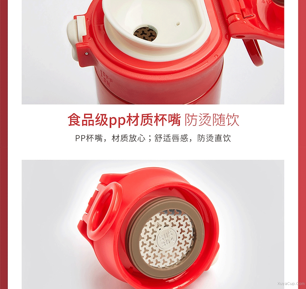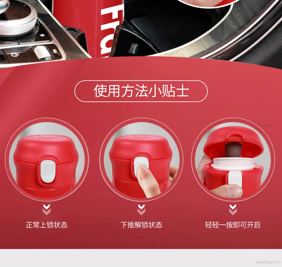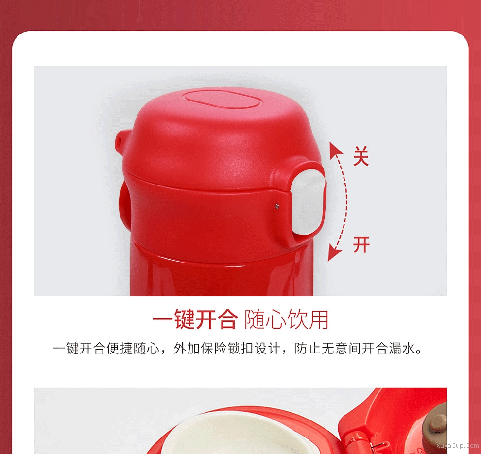 1.一鍵開合,隨心飲用,外加保險鎖扣。 2.PP杯嘴,防燙隨飲,舒適唇感。